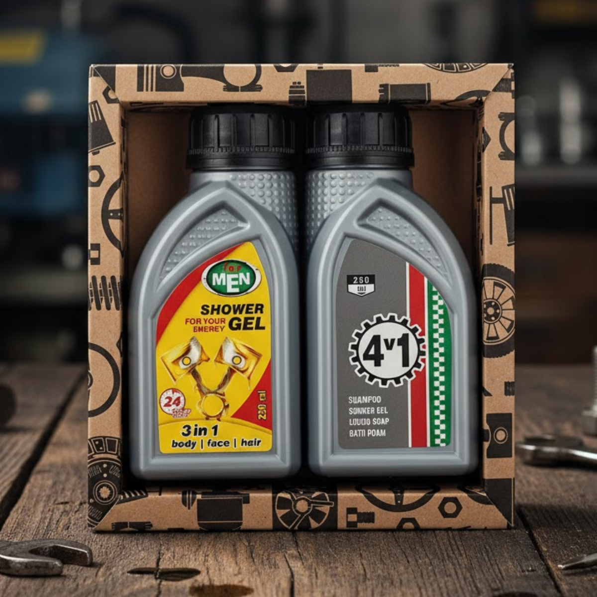 Gift set - shower gel 2x250ml "Helik + 4in1" - an original and exclusive gift for real men who spend a lot of time in the garage! The shower gel and shampoo packaging looks like car oil bottles, making this set perfect for men who like to take care of their body and appreciate funny and practical gifts. The pleasantly scented shower gel/shampoo is suitable for washing the entire body and hair. It has a compelling and modern aroma that refreshes and leaves a pleasant feeling. Due to its composition, the shower gel helps protect the skin from excessive dryness during washing, it is gentle but effective. This is a great choice for active men, providing not only cleanliness but also a sense of comfort after intense sports or work. This is an opportunity to enrich your life with small pleasures and enjoy every moment of the shower. Allow yourself to relax and take care of your body!