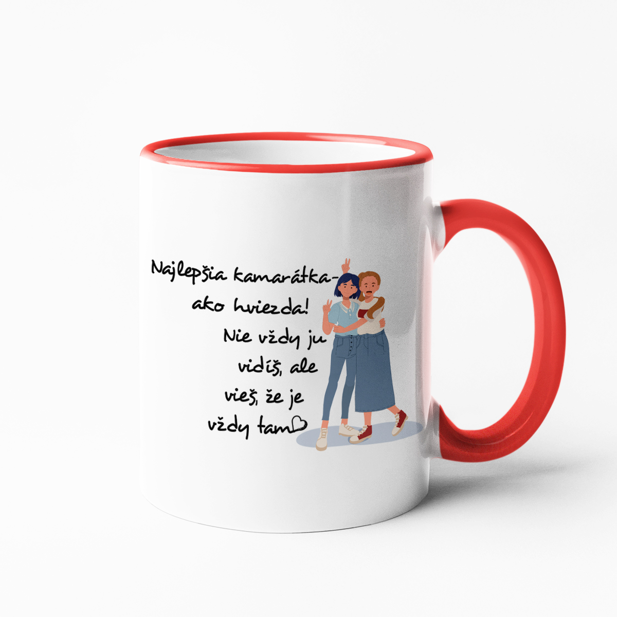 - Hrnček s farebným okrajom – Tento model vyniká svojím štýlovým dizajnom: jemne farebný okraj a uško, ktoré pridávajú hravosť a dokonale zvýraznia jedinečný nápis.
