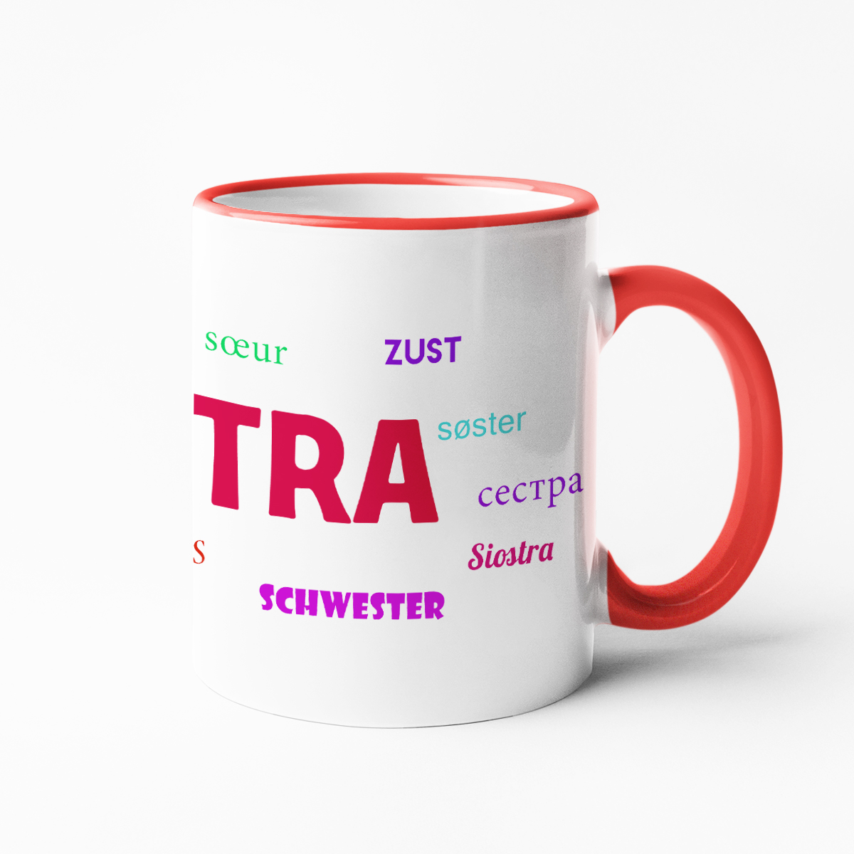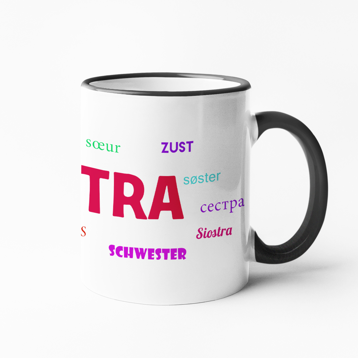- Hrnček s farebným okrajom – Tento model vyniká svojím štýlovým dizajnom: jemne farebný okraj a uško, ktoré pridávajú hravosť a dokonale zvýraznia jedinečný nápis.