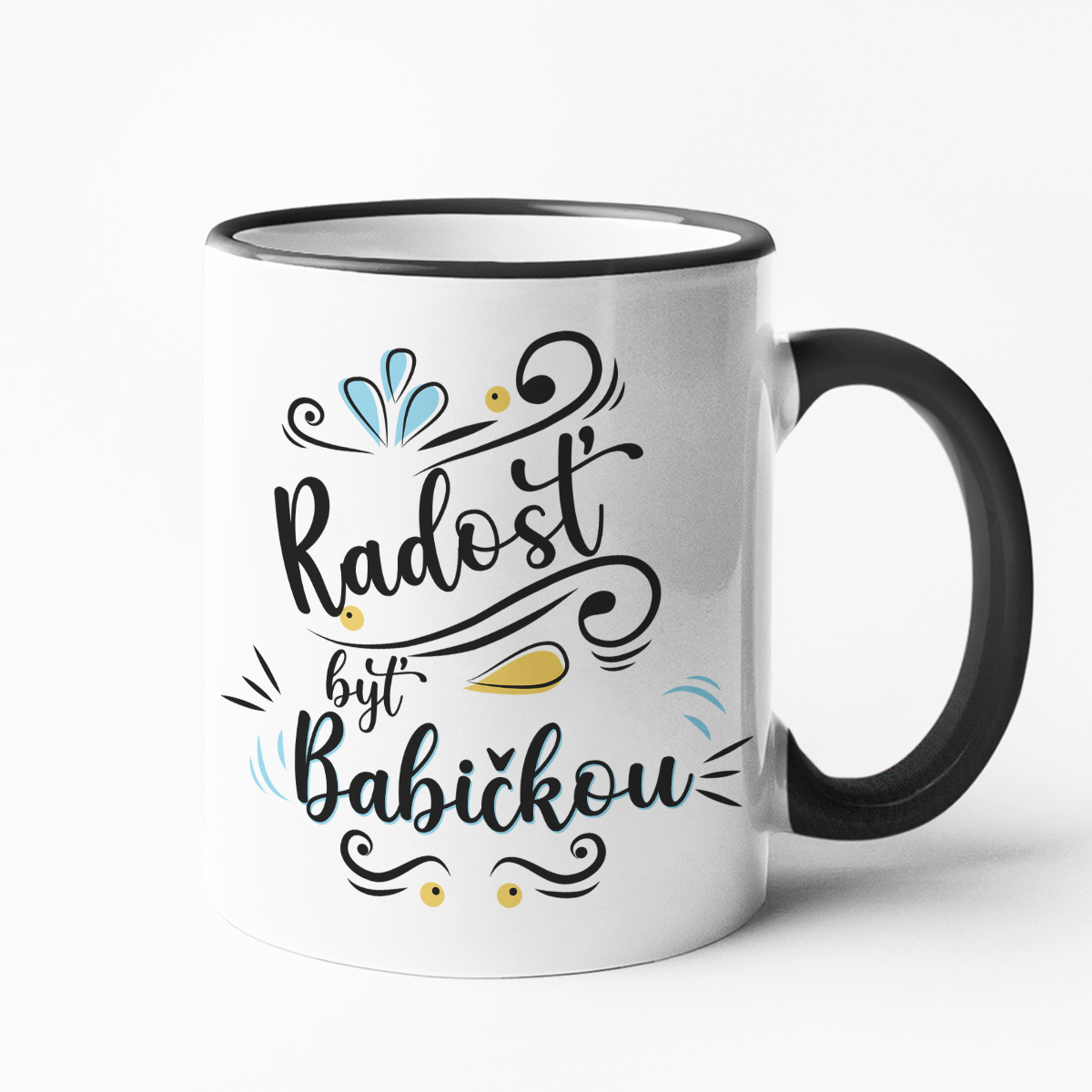- Hrnček s farebným okrajom – Tento model vyniká svojím štýlovým dizajnom: jemne farebný okraj a uško, ktoré pridávajú hravosť a dokonale zvýraznia jedinečný nápis.