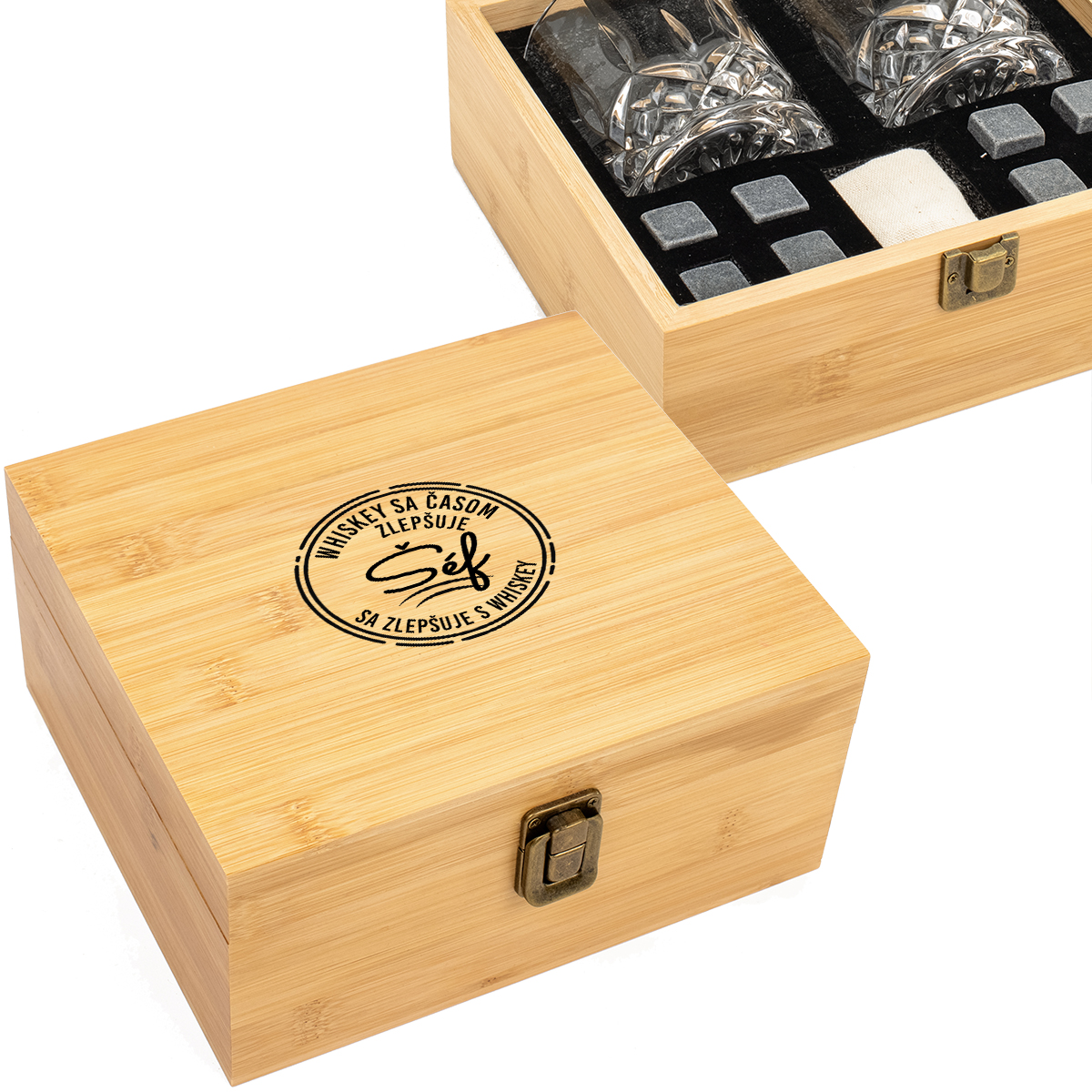 Luxusná sada pohárov na whisky v bambusovej krabičke "Dobrý šéf"